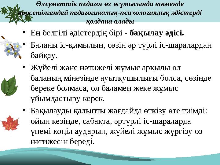 9) Баланың кім болғысы келетінін, айналасындағы достарының әсерін білу мақсатында өз теңі ретінде қабылдап ашық сөйлесу немесе белгілі жұмысты атқаруда бірлесе отырып жұмыстану.