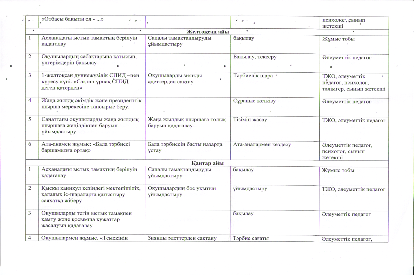 Асханада ыстық тамақпен қамту, оның дұрыс берілуін қадағалау. Сабақтарына қатысып үлгерімін қадағалау, сыныптағы оқушылармен қарым қатынасын бақылай отырып, жаңа жылға дайындау, іс-шараларға қатыстыру, ойындарға қызықтыра отырып дамыту.