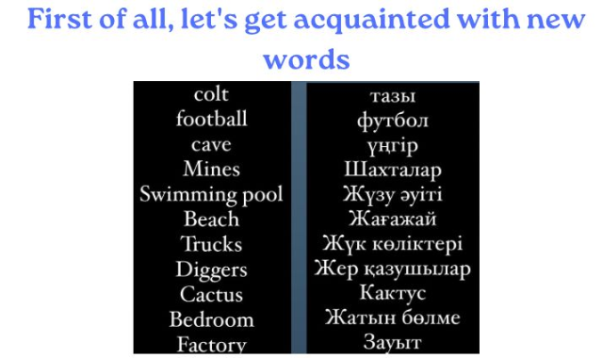 what do you see in the picture? Where do you think the people in Coober Pedy live? What do you think the weather is like there? Exercise 4, page 36 1)in summer, the temperature is between 35 °C and 45 °C. 2) Candice White and her husband live in an.. 3) Inside the house, the temperature can be… 4)The population of Coober Pedy is only… 5)Most people care to Coober Pedy to look for… 6) So, everybody fives and works… the sentence needs to be supplemented further Exercise 5, page 36 test your memory. Mark the sentences true (T) or false (F). Correct the false ones. 1) Opals are black. 2) People wear lights on their heads to play golf. 3) People wear lights on their heads in the mines. 4) The golf ball is blue 5) The golf course is in the riddle of the desert 3 minutes exe Сергіту сәті-Tongue Twisters