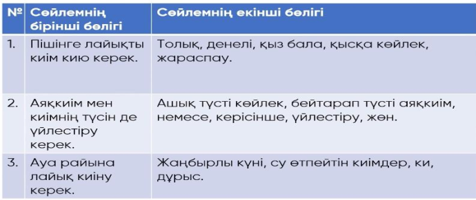 2-тапсырма. Сөйлемнің бірінші бөлігін екінші бөлігімен дұрыстап сәйкестендіріңдер.