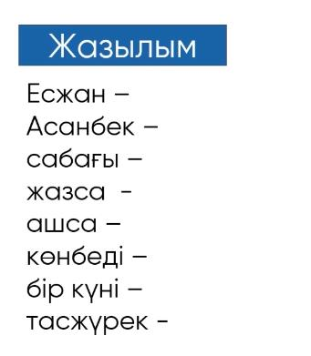5. 1. 3. 1 тыңдалған мәтіннің мазмұнын түсіну, негізгі және қосымша ақпаратты анықтау. 5. 4. 2. 1 сөз ішіндегі және сөз аралығындағы ілгерінді, кейінді және тоғыспалы ықпал заңдылықтарына сәйкес айта білу. |