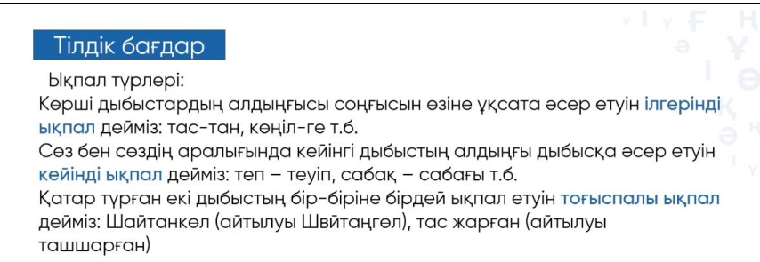 -тыңдалған мәтіннің мазмұнын түсіну, негізгі және қосымша ақпаратты анықтау. 5. 4. 2. 1 сөз ішіндегі және сөз аралығындағы ілгерінді, кейінді және тоғыспалы ықпал заңдылықтарына сәйкес айта білу. |