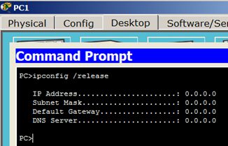 Войдите в конфигурации хоста PC1и PC2 и в командной строке сконфигурируйте протокол TCP/IP. Для этого командой PC> ipconfig /release сбросьте (очистите) старые параметры IP адреса ( рис. 6.15).