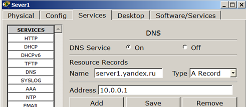 В конфигурации Server1 войдите на вкладку DNS и задайте две ресурсные записи (Resource Records) в прямой зоне DNS.