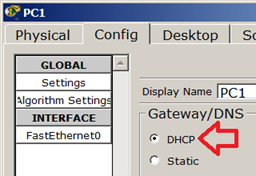 Войдите в конфигурацию PC1 и PC2 и установите настройку IP через DHCP сервер рис. 6.6.