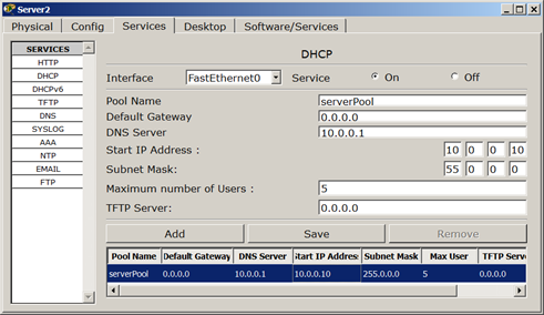 Войдите в конфигурацию Server2 и на вкладке DHCP настройте службу DHCP. Для этого наберите новые значения пула, установите переключатель On и нажмите на кнопку Save (Сохранить) - рис. 6.14.