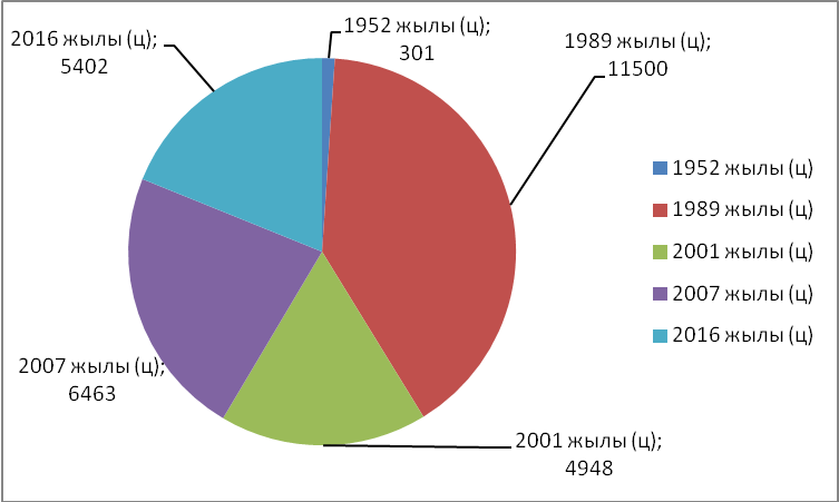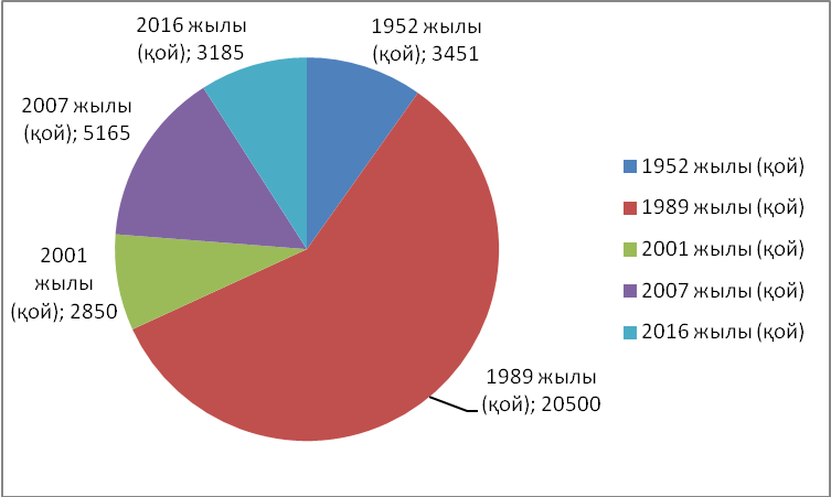 2.2.Науалы ауылында өсірілетін саулық қой саны 1952 жылы – 3401 бас, 1989 жылы – 20500 бас, 2001 жылы – 2850 бас, 2007 жылы – 5165 бас, 2016 жылы – 3185 бас. Саулық қой жылдар бойынша салыстырудың дөңгелек диаграммасын құр (8-сурет).
