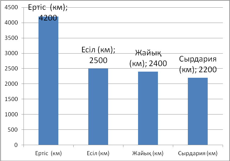 Ертіс – 4200 км, Есіл – 2500 км, Жайық – 2400 км, Сырдария – 2200 км.