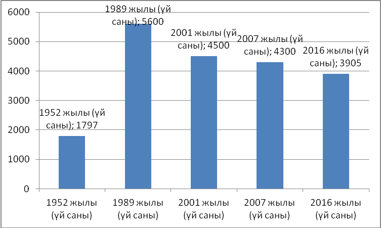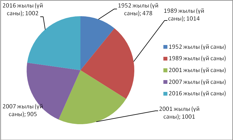 Науалы ауылындағы тұрғын үй саны 1952 жылы – 478, 1989 жылы – 1014, 2001 жылы – 1001, 2007 жылы – 905, 2016 жылы – 1002 үй. Тұрғын үй санының жылдар бойынша бағанды диаграммасын құр (5-сурет).