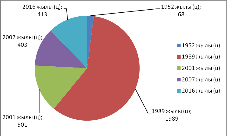 4.2.Науалы ауылында өндірілетін жүн өнімдерінің үкіметке сатылатын өнімдері 1952 жылы – 68 ц, 1989 жылы – 1989 ц, 2001 жылы – 501 ц, 2007 жылы – 403 ц, 2016 жылы – 413 ц. Үкіметке сатылатын жүн өнімдерін жылдар бойынша салыстырудың дөңгелек диаграммасын құр (12-сурет).