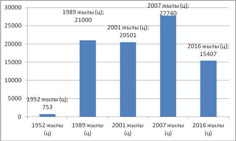 Науалы ауылында тұратын халық саны 1952 жылы – 1797, 1989 жылы – 5600, 2001 жылы – 4500, 2007 жылы – 4300, 2016 жылы – 3905. Халық санын жылдар бойынша салыстырудың бағанды диаграммасын құру (6-сурет).