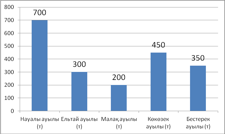 Үржар ауданына жақын орналасқан ауылдардан атмосфераға шығаратынлас қалдық заттар. Науалы ауылы – 700 т, Ельтай – 300 т, Малақ ауылы – 200 т, Көкөзек ауылы – 450 т, Бестерек ауылы – 350 т. Атмосфераға шығарылатын лас қалдық заттарды салыстырудың бағанды диаграммасын құру (4-сурет).