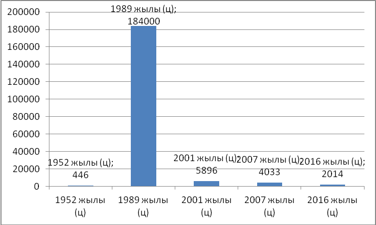 4.1.Науалы ауылында малдардан өнідірілетін сүт өнімдерінің үкіметке сатылатын 1952 жылы – 446 ц, 1989 жылы – 184000 ц, 2001 жылы – 5896 ц, 2007 жылы – 4033 ц, 2016 жылы – 2014 ц. Үкіметке сатылатын сүт өнімдерінің бағанды диаграммасын құр (11-сурет).