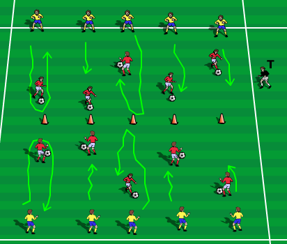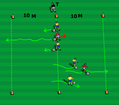 Міндеті: допты қадағалау және доппен бұрылудың техникалық дағдыларын шыңдау. Футболшылардың ойын кезінде жан-жақтарын (кеңістікті) бағдарлай білу біліктіліктерімен таныстыру. Мазмұны: көлемі 20×20 м болатын алаңда (20×40 м алаңының жартысы) аз құраммен ойнау. Қақпаның көлемі 1×1,5 м. Тапсырмаға қойылатын талаптар: допты қабылдаған соң, оны бірден теппей, техникалық тәсіл жасау керек: доппен «адымдап» қозғалу, доппен бұрылып, ойыншы жоқ аумаққа ауысу, жақсы көңіл-күйді сақтай білу, ойыннан ләззат алу. |