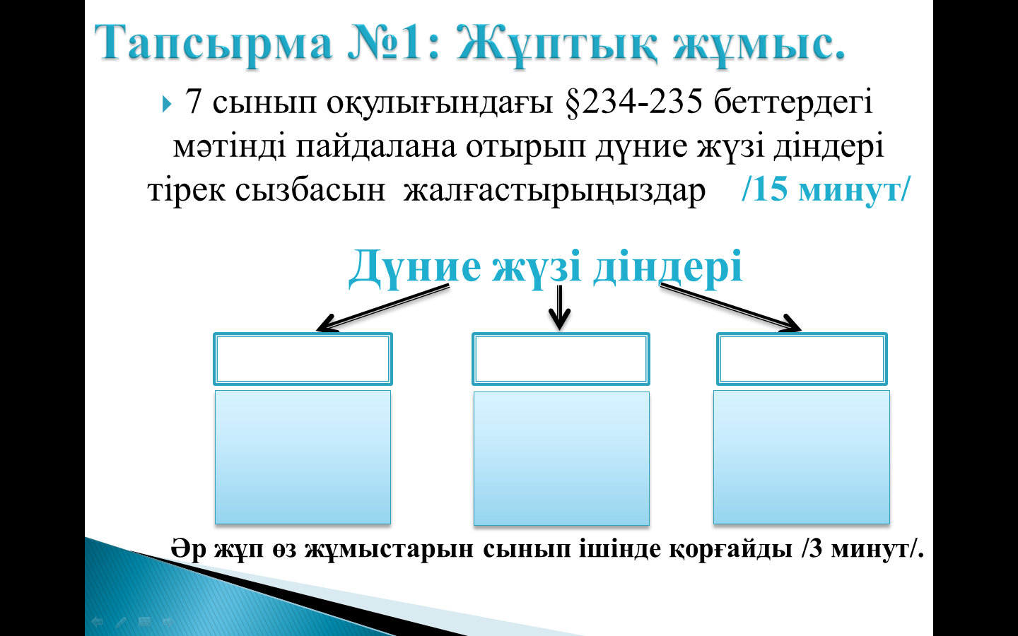 ІІ. Жаңа сабақ. Жеке жұмыс. Тапсырма №1: Дүниежүзі халқының діни құрамы мен таралу аймақтарын анықтаңыз. 7 сынып оқулығындағы §47-48, 76-77 беттердегі мәтінді пайдалана отырып дүние жүзі діндері тірек сызбасын жалғастырыңыз.