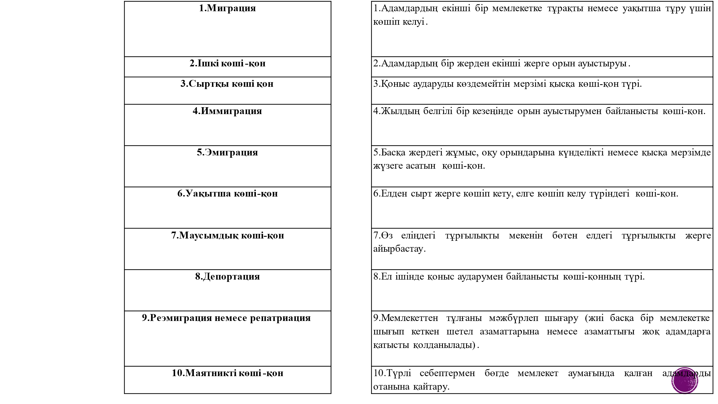 9.4.1.2 дүниежүзі халқы миграцияларының басты бағыттарын, себеп-салдарын түсіндіреді 9.4.1.3 Қазақстандағы көші-қон үдерістерді талдап, басты бағыттарын анықтайды; |