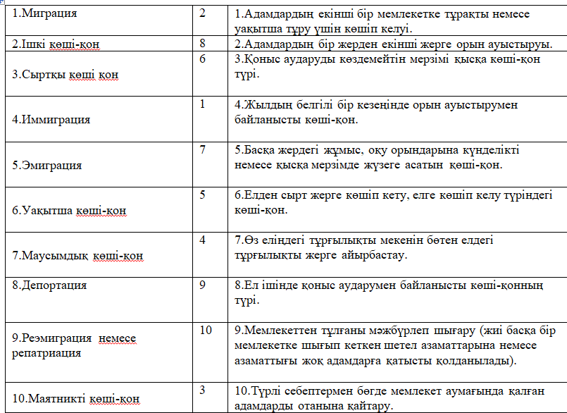 І. Жаңа сабақтың тақырыбы бойынша оқушыларға видео-, презентация-таныстырылым көрсетеді Сұрақтарға жауап береді 1.Миграция дегеніміз не? 2.Эмиграция дегеніміз не? 3.Репатриация дегеніміз не? 4.Сыртқы көші-қон дегеніміз не? 5.Ішкі көші-қон дегеніміз не? ЕБҚ оқушылар маңызды тірек сөздерді жазып алады; 1Тапсырма: «Ойлан, жұптас, бөліс» әдісі арқылы мәтін, картамен жұмыс ЕБҚ: оқушыға топтық жұмыс кезінде қасындағы сыныптастары және мұғалім диалог арқылы қолдау жасайды