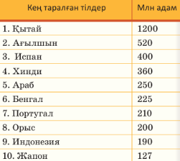 Әр тілде амандасу арқылы тақырыпты анықтайды Сабаққа мақсат қояды Бейнероликті қарайды. Әлем тілдерін сипаттап талдайды Оқушылар дүниежүзінің тіл әулеттерін таңдап олардың әлемде таралуы бойынша сипаттайды. Оқушылар әлемдегі кең таралған 10 тілді диаграмма түрінде көрсетеді Оқушылар тіл әулеттерінің белгілері бойынша сәйкестендіреді |