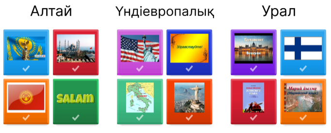 «Жарайсың» деген мадақтау сөзімен ынталандыру. Дескриптор: Жалпы 3 – балл: 1.Дүниежүзінде кең таралған тіл әулеттерін анықтап сипаттайды. Дескриптор: Жалпы 3 – балл: 1.Дүниежүзіндегі кең таралған тілдерді анықтап диаграмма түрінде ұсынады Дескриптор: Жалпы 3 – балл: 1.Алтай тіл әулетін сәйкестендіреді 2.Үндіеуропалық тіл әулетін сәйкестендіреді 3.Орал тіл әулетін анықтайды |