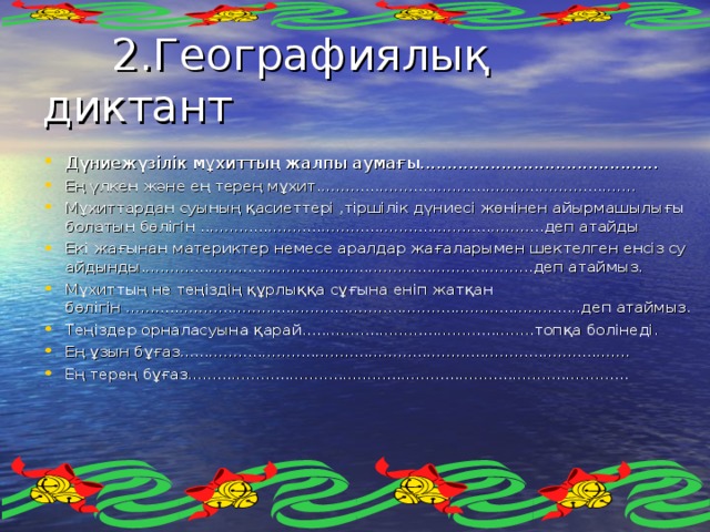 «дүниежүзілік мұхит» ұғымын түсіндіреді «Дүниежүзілік мұхит » ұғымын түсіндіре алады және оның бөліктеріне сипаттама береді. Дүниежүзілік мұхит және оның бөліктерінің ерекшеліктерін графикалық түрде бейнелей алады, оны түсіндіреді |