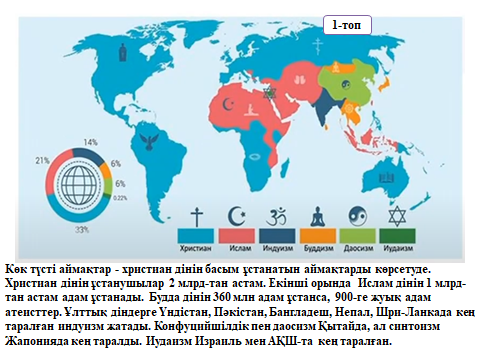 7.4.1.2 -дүние жүзі халқының діни құрамы мен діндердің таралу аймақтарын анықтайды |