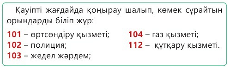 Мәтінді түсініп оқиды. Сергіту сәтін іс-қимылмен көрсетеді. "Қазақстанда болуы ықтимал табиғат апаттарының картасына" (74-беттегі) қарап, қауіптердің шартты белгілерімен мұқият танысады. Картадан өзі тұратын облысты табады. Өз жеріңде болуы мүмкін табиғат апаттарын атайды. Ол туралы білгенін айтып береді. Жағдайды талқылайды. Біздің жерімізде болатын катаклизмдердің тізімін жасап, мына сұрақтарға жауап береді. |