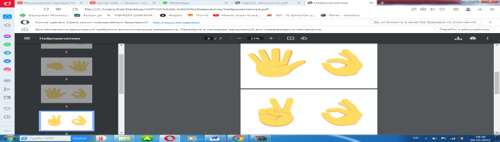 І. Ынтымақтастық атмосферасын және өздеріне сенімділік қалыптастыру ширату жаттығулары арқылы жүреді. «Нейро жаттығу» Тақтада көрсетілген суреттер бойынша нейро жаттығу жасайды. ІІ.Үй тапсырмасын сұрау ІІІ. Ой қозғау Сабақ тақырыбы мен мақсаты хабарланады. |