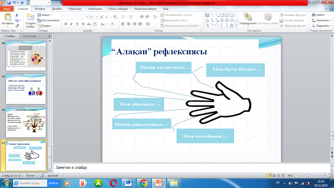 Бүгінгі сабақта алған білімдері бойынша рефлексия жасайды. |