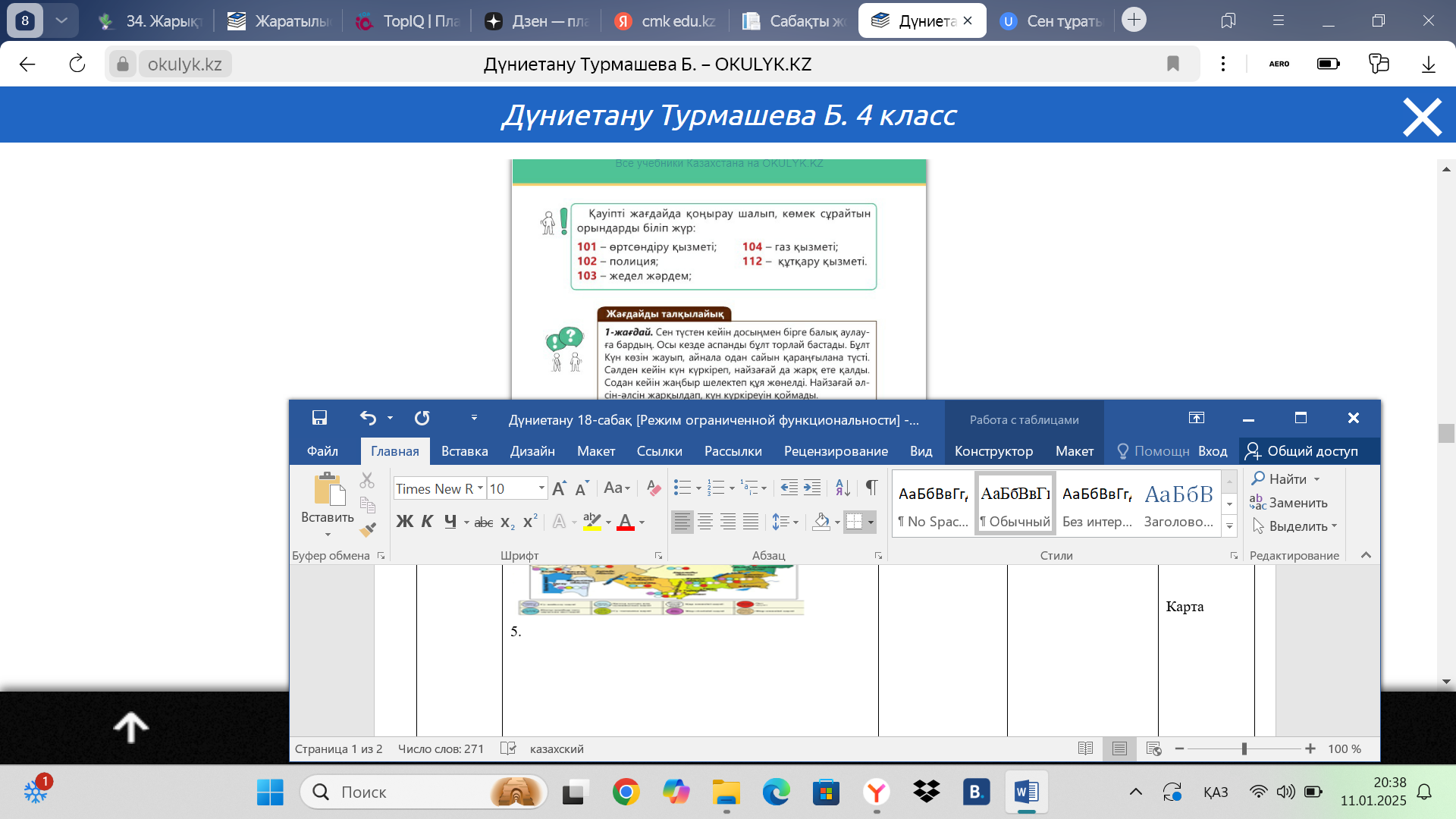 Дескриптор: -Сурет бойынша сұрақтарға жауап береді;1б - Катаклизмдер туралы естігенін айтып береді.-1б Дескриптор: Қазақстанның физикалық картасы бойынша саяхат жасайды-1б Дескриптор: - Аталған жер-су атауларын (тау, өзен, көлдерді) картадан тауып көрсетеді-1б Дескриптор: -Картадан қауіптердің шартты белгілерімен танысады-1б - Картадан өзің тұратын облысты табады-1б -жағдаяттарды талқылайды-1б -сұрақтарға жауап береді-1б Дескриптор: - Біздің жерімізде болатын катаклизмдердің тізімін жасайды-1б - сұрақтарға жауап береді-1б |