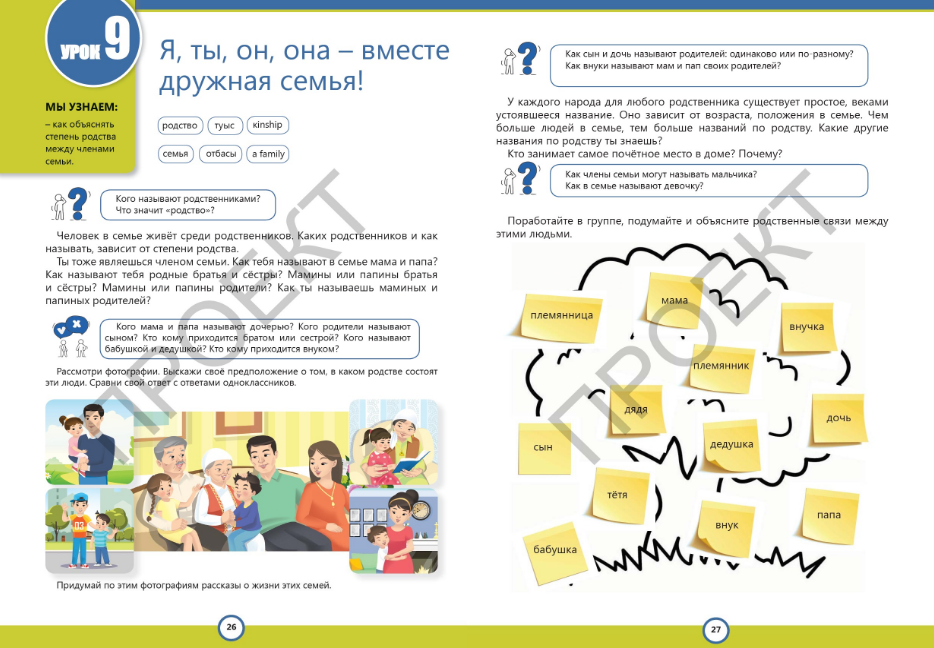 Сөздік жұмыс. Отбасы –семья-family Туыс- родственник – kinship (Ұ) Оқулықпен жұмыс. 27 бет Туыстық атаулармен таныстыру. «Picture dicktation» «Суретті диктант» әдісі Оқулықтағы берілген туыстық атауларды тақтаға жазу. Сөздерді оқып,жеміс ағашына қою . 1.Әкең мен анаң кімді қызым дейді?-Ал кімді ұлым дейді? 2.Кім кімге аға мен іні немесе әпкесі мен қарындасы, сіңлісі болады? 3.Кімдерді ата мен әже дейді? 4.Кім кімге немере, жиен болады? Дескриптор: 4 балл - отбасы мүшелерінің арасындағы туыстық қатынастарды түсіндіре алады. - отбасындағы туыстық қатынастарды түсінеді. - отбасы мүшелерінің арасындағы сыйластықты түсіндіреді. Жұптық жұмыс Тапысымалар әр партаға таратылады Логикалық сұрақтар 1.Менің атым Медет. Менің апамның бір ғана інісі бар. Менің апамның інісінің аты кім? 2.Көшеде екі әкесі, екі баласы, және атасы немересімен қыдырып жүр. Көшеде неше адам жүр? 3.Анаңның апасының баласы саған кім болады? ( бөле) 4.Нағашы ата-әжеңе сен кім боласың? 5.Мен ата-анама кім боламын? (ұлымын, қызымын) 6.Бір үйде 4 қыз бар оның әрқайсысының бір інісі бар, бұл үйде неше бала бар? 7.Анаңның ағасы саған кім болып келеді? (нағашы) 8.Әкеңнің әкесі саған кім болып келеді? (ата) 9.Әкеңнің анасына сен кім боласың? (немере) Топтық жұмыс. «Қиялдағы отбасы» Оқушыларды 4 топқа бөліп, фотосуреттерді тарату. Тапсырма: Туыс атауларын жаз. Суретке тақырып таңда Дескриптор: - Туыс атауларын жазады - суретке тақырып қояды ЕБҚ «Диалог және қолдау көрсету» арқылы жүргізіледі. -Отбасыңда ортақ мақсат құрып, бірге атқарған істеріңді ата. Оны басқару кімнің қолынан келді? Досының көмегі Сергіту сәті Барлығымыз тұрамыз Кімнің ағасы бар болса, қолдарын көтерсін. Кімнің сіңлісі болса, оң қолын көтерсін Кімнің қарындасы болса, сол қолын көтерсін Кімнің әжесі болса, сол құлағын ұстасын Кімнің атасы болса, оң құлағын ұстасын Кімнің туысқандары бар болса, шапалақтасын Кері байланыс: Дәптердегі смайликтер арқылы кері байланыс жасалады. |