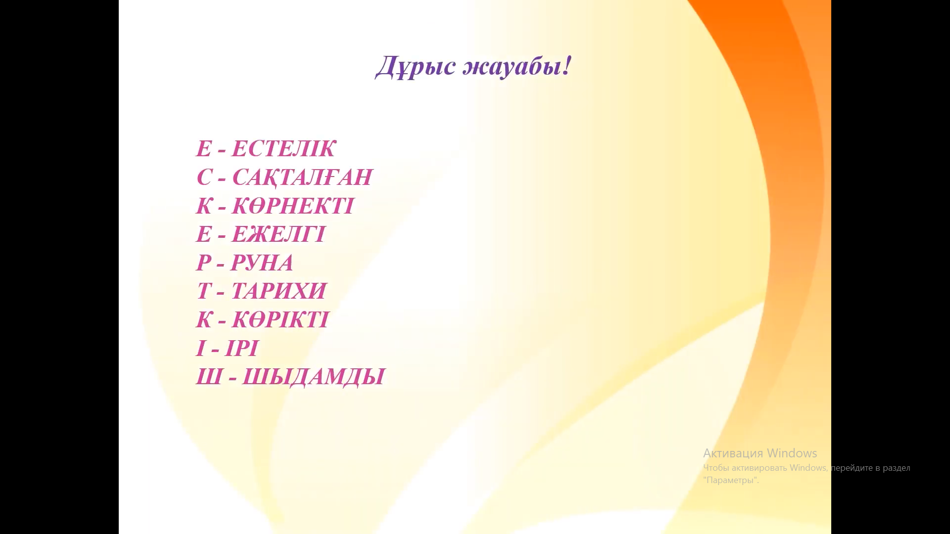-Балалар, «ескерткіш» сөзінің әр дыбысынан тақырыпқа сай сөз құрап көрейікші.
