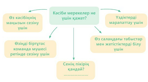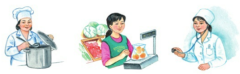 Сауалнама жүргізеді. Біздің елімізде аталып өтетін кәсіби мерекелердің күнтізбесін жасайды. Мемлекеттік және кәсіби мерекелерді салыстырады. Ұқсастықтары мен айырмашылықтарын табады. Суреттерге қарап, қандай мамандық иелері туралы айтылғанын болжайды. Сұрақтарға жауап береді, өз ойларын айтады. |