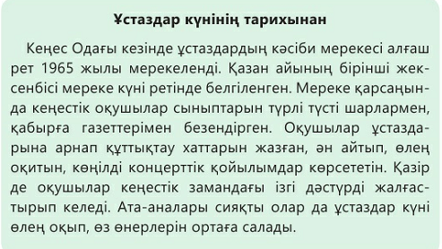 Суреттерге қарап, оларды не біріктіретінін айтып береді. Мәтінді түсініп оқиды. Ойланып, кәсіби мерекелердің не үшін қажет екенін анықтап көреді. Ойын дәптерге жазады. Ұстаздар күнінің аталып өту тарихын оқиды |