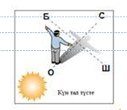 3.Көкжиектің тұстарын Күнге қарап қалай анықтайды? Суретке сүйеніп, сипаттап жаз. Суретке көкжиектің тұстарын жаз.