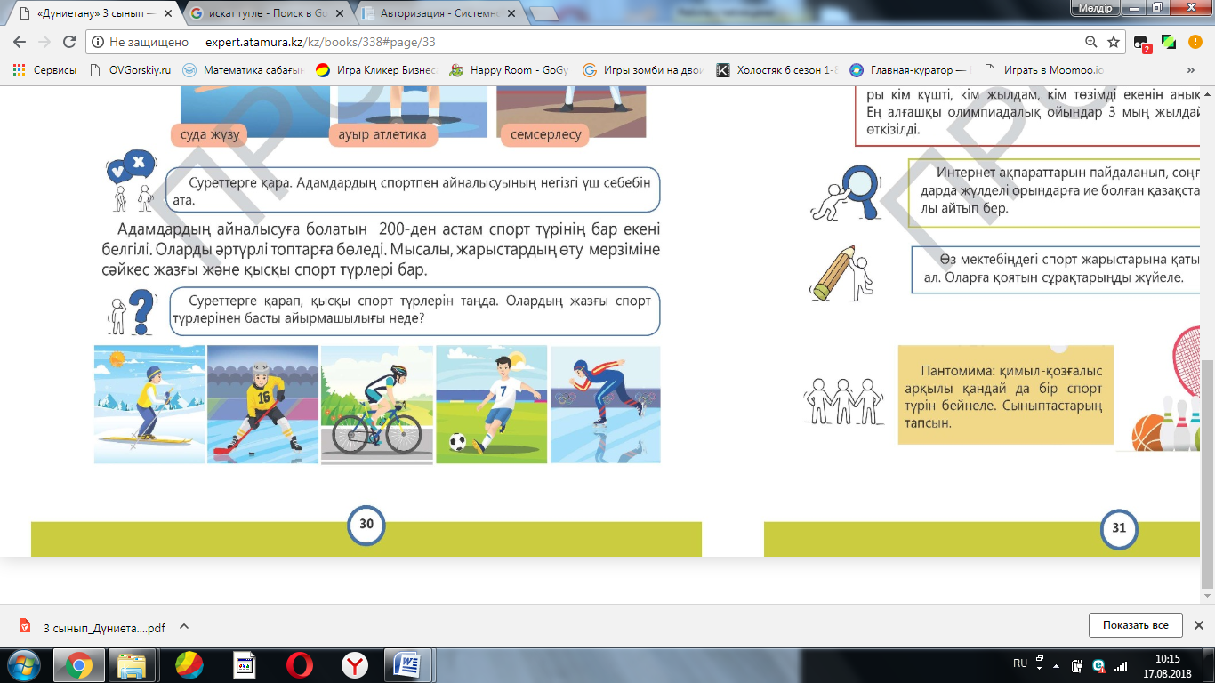 Дескриптор: Қандай спорт түрімен айналысқан дұрыс? Спортқа келерде алдыңа қандай мақсат қойдың? Адамдар неліктен спорпен айналысады деп ойлайсыңдар? ҚБ: Бас бармақ арқылы бір-бірін бағалау. Жұмыс дәптеріндегі жазылым тапсырмаларын орындау |