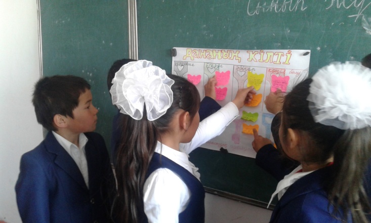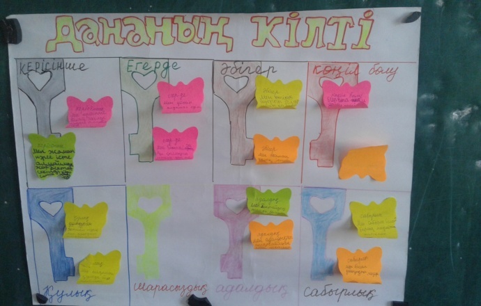 Оқушылардың білімдерін жинақтау мақсатында Тони Райан жасаған «Дананың кілттері» әдісін қолданудағы мақсатым, бірқатар көмекші сұрақтар немесе тапсырмаларға оқушылардың талдау жасауына, сын тұрғысынан ойлауына көмектесетін кілт түрінде ұсынылды. Мысалы «Керісінше» кілті, «Істей алмаймын», «Істемеймін» сөздерін пайдалануды көздейтін тапсырмаға Бектай сияқты ешқашан өтірік айтпаймын деп жазды А. Басқа кілттерге оқушылардың айтқан ойлары мен пікірлерін тыңдай отырып, бағалау критерийлерін қолданып, қорытынды (жиынтық) бағаны шығардым. «Екі жұлдыз, бір тілек» әдісімен кері байланыс жасай отырып, сабақты аяқтап ой түйіндедім. Сабақ барысында ақпаратты ұғыну, бағалау, талдау нәтижесінде жаңа нәрсені ойлап табуға, бір нәрсені елестетуге, баламалы шешім қабылдауы үшін оқушыларға жетелейтін сұрақтар қою арқылы оқушылдардың сын тұрғысынан ойлауына мүмкіндік бердім.