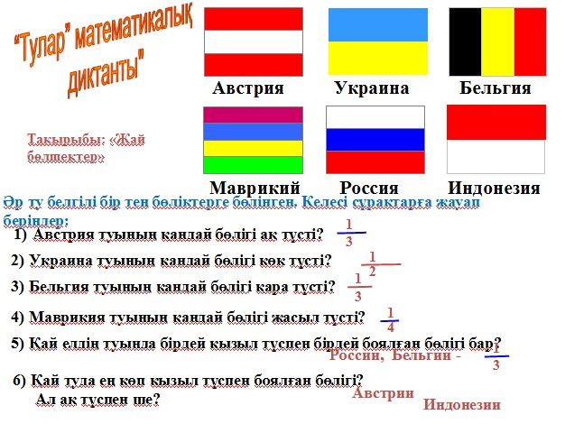 Ынталандыру. Бағалау критерийі: -дұрыс бөлшектерді табады; 1 балл -бұрыс бөлшектерді табады, 1 балл Жалпы балл: 2 балл Ынталандыру . Бағалау критерийі: - Австрия туының қандай бөлігі ақ түсті екенің және бөлшектін түрін анықтайды ; 1 балл - Украина туының қандай бөлігі көк түсті екенің ажыратады және бөлшектін ттүрін табады; 1 балл - Маврикий туының қандай бөлігі жасыл түсті екенің анықтайды және бөлшектін түрін табады. 1 балл Жалпы балл: 3 балл |