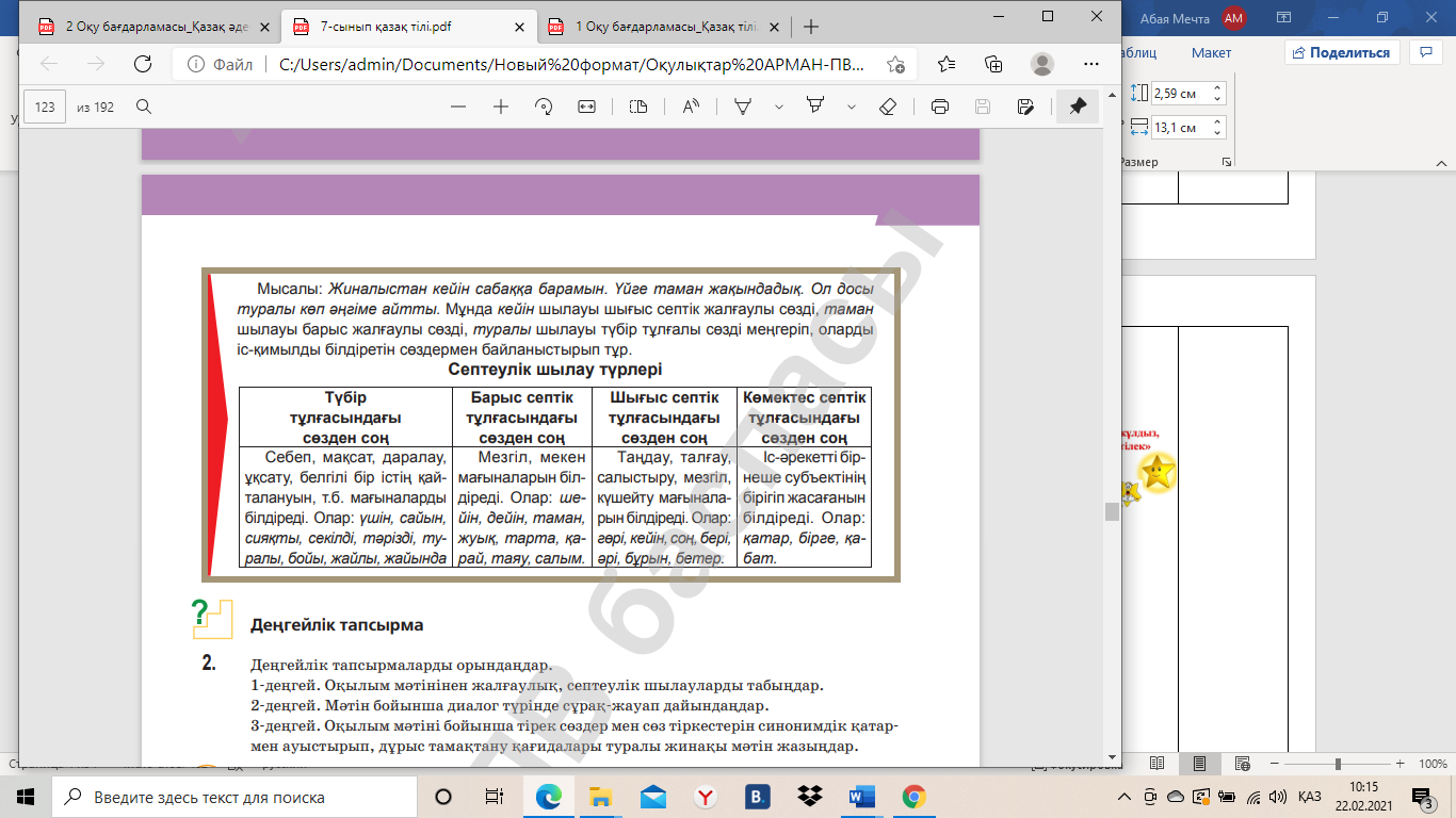 7.2.1.1 мәтіндік және графиктік (кесте, диаграмма, сурет, шартты белгілер) ақпаратты интерпретациялау; 7.4.4.3 шылау түрлерін ажырата білу, орынды қолдану. |
