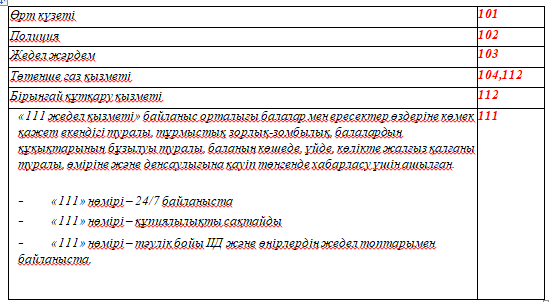 Төтенше жағдай болған жағдайда қоңырау соғатын қызмет туралы мағлұмат алады |