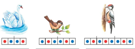 Нұсқау: Берілген сызбаға сәйкес суретті (аққу, торғай, тоқылдақ) тауып, буындап оқу.