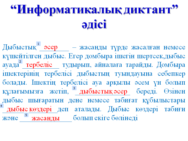 Ұйымдастыру кезеңі 1.Оқушылармен сәлемдесу. 2.Оқушыларды түгелдеу. «Микрофон» әдісі арқылы психологиялық жағымды ахуал туғызамын. Өткен тақырыпты еске түсіру мақсатында «Информатикалық диктант» әдісін қолдану. Сурет, ....... арқылы берілген
