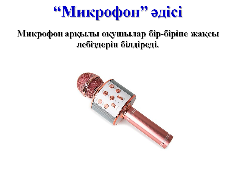 Оқушылар «Мкрофон» әдісі арқылы микрофонмен оқушылар бір-біріне жақсы лебіздерін білдіру арқылы назарларын сабаққа аударады. Өткен сабақты еске түсіру үшін берілген таратпа материалындағы сөйлемді оқи отырып, бос орындағы сөздерді табады |