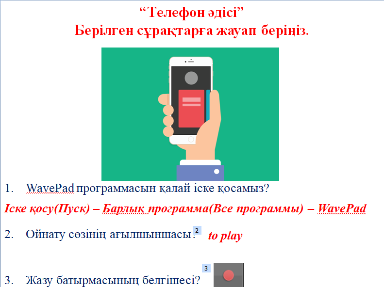 Сөйлеу қабілетін дамыту мақсатында “Телефон әдісі” арқылы сабақты бекітемін.