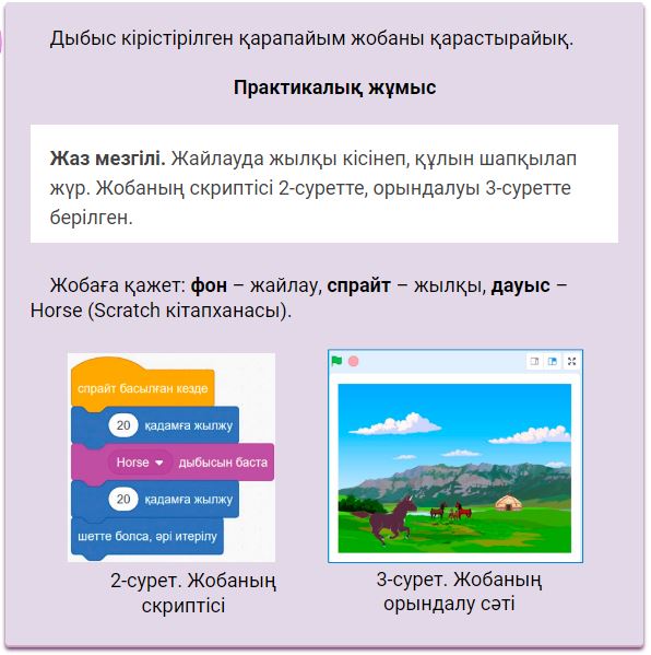 Жаңа сабақты сөйлеу дағдыларын дамыту мақсатында слайдтағы материалдарға өз пікірлерін білдіріп, тақырыпты түсінеді. Оқушылар компьютерге отырып, практикалық тапсырма орындайды. Берілген тапсырманы скретч кітапханасынан жылқы дыбысын таңдап, сақтау жолдарын үйренеді. Оқушылардың компьютерлік сауаттылығы артады ЕББҚ ететін оқушы берілген тапсырманы компьютерде қажетті программаны ашып, дыбыстарды жазып сақтайды. |
