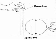 2. Способы измерения ЖЕЛ - Изучите способы измерения ЖЕЛ. Я предлагаю три способа. Мундштук( пластиковая трубка для измерения дыхательных способностей пациента) 1 способ Оборудование: спирометр, мундштук, спирт, вата, носовой зажим Мундштук спирометра обрабатывают спиртом. Стрелку спирометра устанавливают на 0. Исследования проводят в положении стоя. Испытуемый после максимального вдоха делает максимально глубокий выдох в спирометр. Носовое дыхание исключают, используя зажим для носа. Повторяют измерения трижды и вычисляют среднее значение данного параметра. Показатели вносятся в таблицу. После определения жизненной ёмкости лёгких сравнивают ее значение с должной величиной, учитывая пол, возраст и рост. Отклонения на ± 15% от должной ЖЕЛ считаются нормой 2 способ Оборудование: линейка, воздушный шарик 1. После спокойного дыхания, вдохнуть так глубоко, как только можно, и затем сделать глубокий, насколько это возможно, выдох в воздушный шар. 2. Сразу же закрутить отверстие воздушного шара. Положив шар на плоскую поверхность(стол), линейкой измерить диаметр шара, как это показано на рисунке. Затем определить радиус шара 3. Сдуть воздушный шар и повторите то же самое еще два раза. Взять средний результат и произвести вычисления по формуле