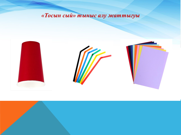 Психологиялық ахуал тудыру, топтастыру. «Тосын сый» тыныс алу жаттығуы арқылы ұстаздардың көңіл-күйлерін көтеру, психологиялық жағдай жасау, топтастыру. Партадағы төңкерілген стакандардарға түтікшемен дем алып, демін тартып қағазды стаканның үстіне қояды. Стаканның ішіндегі тосын сыйды алады.