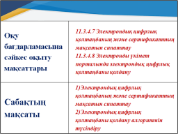Оқу бағдарламасына сәйкес оқыту мақсаттары 11.3.4.7 Электрондық цифрлық қолтаңбаның және сертификаттың мақсатын сипаттау