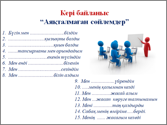 1.Оқушыларға өзін-өзі бағалауды ұйымдастырады. 2.Кері байланыс: «Аяқталмаған сөйлемдер»