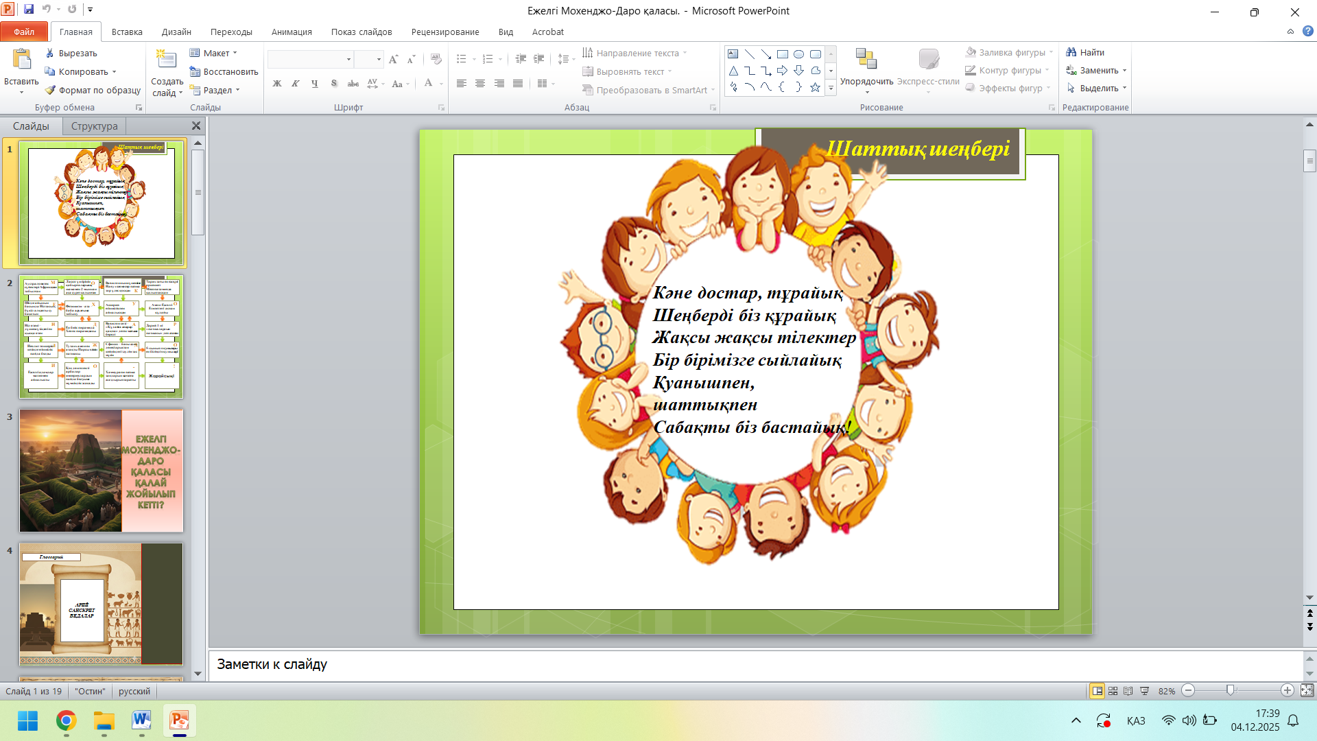 -Мохенджо-Даро сөзін бірінші рет естіп тұрсыз ба? -Бұл сөз саған қандай әсер қалдырды? Мысалы, ол бір тағамның, адамның есіміне немесе басқа бір нәрсеге ұқсай ма? -Бұл сөздің дыбысталуы саған қандай тілге немесе қандай елге жататын сияқты көрінеді? Бұл сабақта сіздер: -Үндістанның ежелгі өркениеттерінің ерекшелігін зерттейсіздер; -тарихи деректердің мазмұнын түсіндіресіздер; -Мохенджо-Даро қаласының жойылып кету себептерін анықтайсыздар. Кіріспе. Жаңа тақырыпты презентация және Gemini платформасы арқылы жасалған бейнероликпен тақырыпты түсіндіремін. Глоссарий: АРИЙ САНСКРИТ ВЕДАЛАР Азияның оңтүстігінде Үндістан түбегі орналасқан. Бұл жерде екі ірі өзен: Үнді және Ганг ағып өтеді. Б.з.д. III мыңжылдықтың ортасында Үнді өзенінің аңғарында ерек- ше Үнді өркениеті қалыптасты. ЕҢБЕКҚОРЛЫҚ ЖӘНЕ КӘСІБИ БІЛІКТІЛІК Еңбекті, өзінің және басқалардың еңбек нәтижелерін бағалау Мохенджо-Даро қаласының дамуы сол кезеңдегі адамдардың еңбексүйгіштігі мен жоғары кәсіби шеберлігінің арқасында жүзеге асқан. Олар үйлерді күйдірілген кірпіштен салып, дамыған су жүйесін ойлап тауып, қолөнері мен саудасын дамытты. Бұл – еңбектің нәтижесі мен шеберліктің адамзат өркениетінде маңызды рөл атқаратынын дәлелдейді. 1-тапсырма Оқушыларға топтық жұмыс беру. Тарихшылар – Мәтінмен жұмыс. Оқулықта берілген (78-бет) мәтінді өзара топ ішінде оқу, талқылау, сұрақтарға жауап беру. Үйлер әдетте қанша қабаттан тұрды? -Әрбір үйдің ерекшелігін айт -Алтын қайдан келді? -Жазудың табылуы туралы не айтасың? Археологтар – Картамен жұмыс