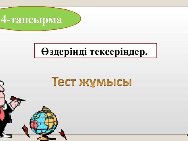 Оқушыларға оқулықтағы тест тапсырмасын дәптерге орындауға беремін. 176-177 бет Жауабы: 1-в 2-а 3-с 4-д 5-а |